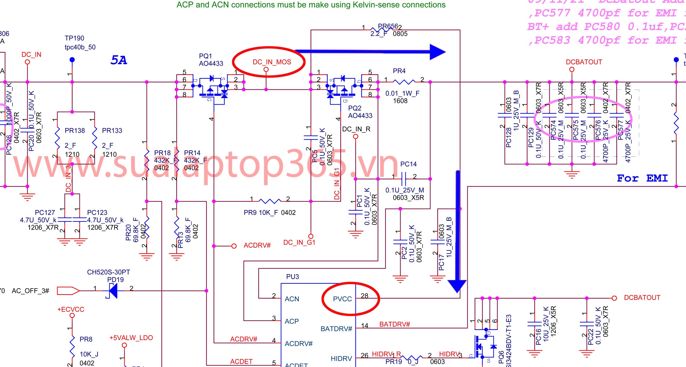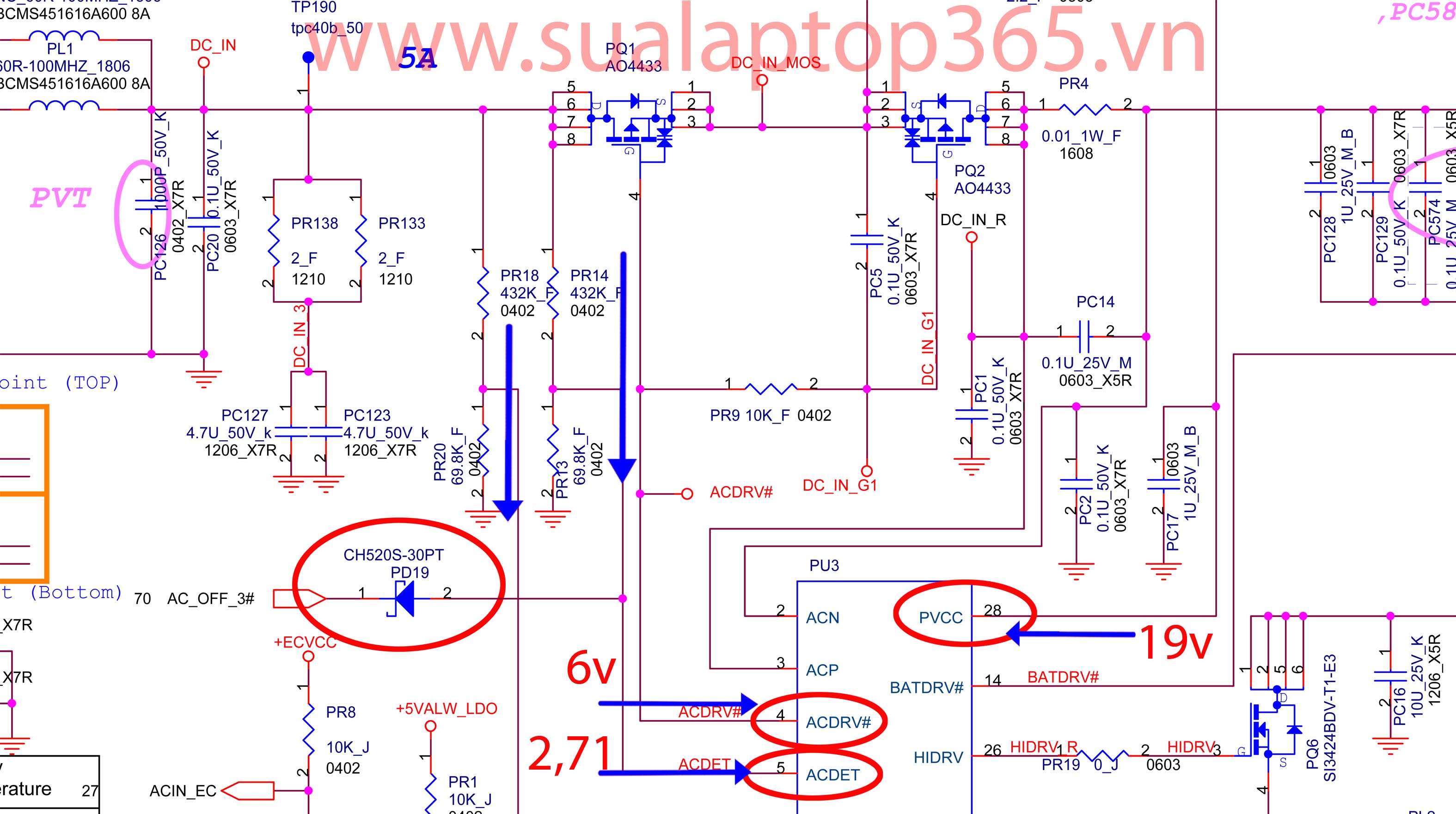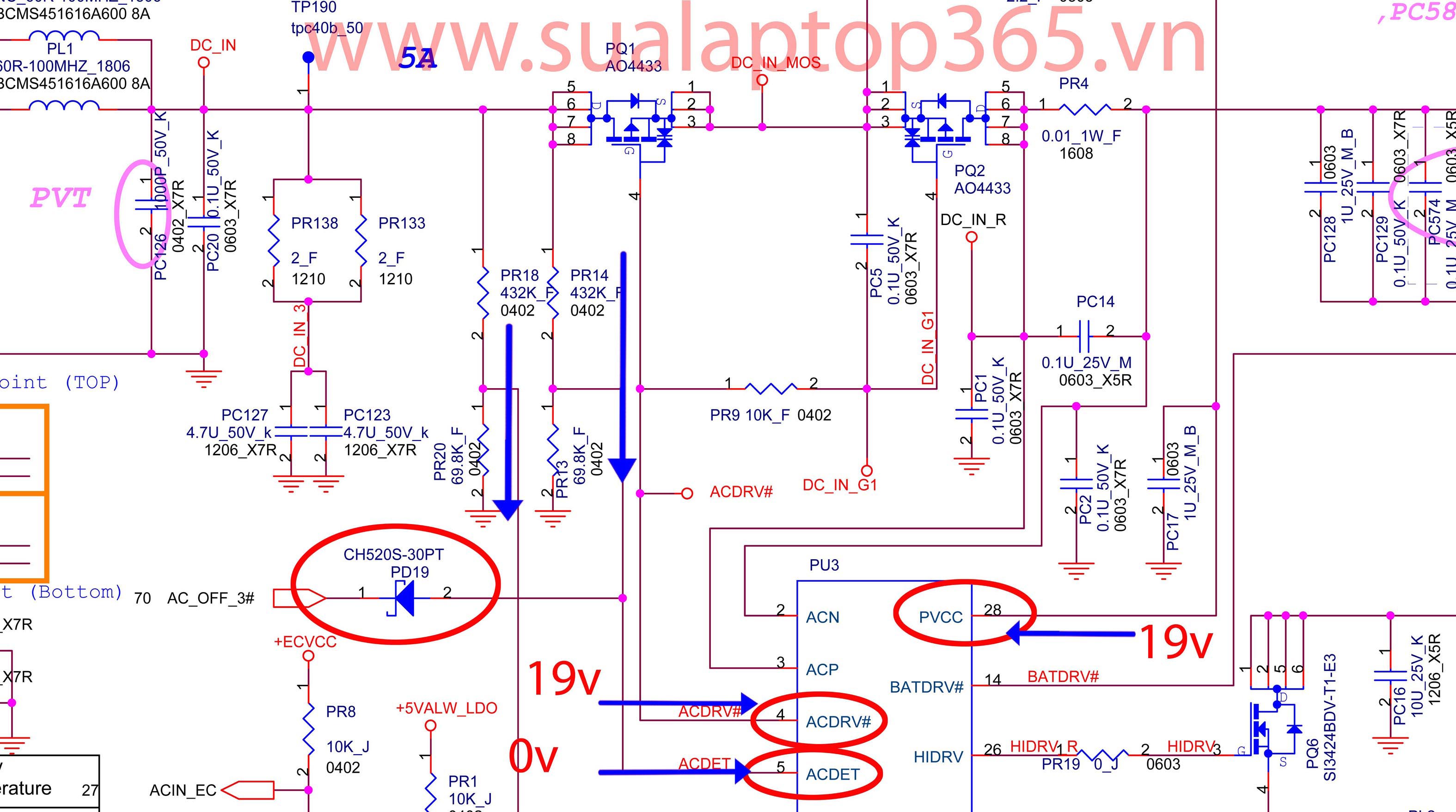 CHIA SẺ PAN MẤT NGUỒN ĐẦU VÀO SONY MBX23 Posted by admin | Feb 03, 2015 | Comments Off on CHIA SẺ PAN MẤT NGUỒN ĐẦU VÀO SONY MBX23 Tình trạng nhận máy ban đầu không bật nguồn bằng adapter được, chỉ kích nguồn được từ pin. Tiến hành kiểm tra sơ bộ thấy có điện áp 19 tại chân số 28 của IC sạc pin. Nghĩ là hỏng IC sạc pin, tiến hành thay IC này. Thay xong tình hình vẫn không thay đổi. Phân tích lại từ đầu từng bước 1. Nguồn từ Adapter đi qua hai cuộn dây đổi tên thành DC_IN. Điện áp DC_IN đi qua diode PD18 đổi tên thành DC_IN_MOS. DC_IN_MOS đi qua PR 656 cấp nguồn vào chân số 28 của IC sạc pin để tạo ra điện chuẩn 2,4v để so sánh với mạch nhận dạng Adpater nằm trong IC sạc pin Đo tại chân IC sạc pin thấy chân số 5 của IC sạc pin có áp 0v đúng vì điện áp DC_IN đi qua cầu phân áp tính theo công thức = (19,5* 69,8)/(69,8+432)=2,71v, chân số 4 có áp 19v kích vào chân G của PQ1 là fet thuận sẽ ngắt nguồn đầu vào. Tiến hành cách ly diode PD19 thấy áp chân số 5 lên 2,71v chân số 4 về 6v. Kiểm tra diode PD19 thấy bình thường. Dò ngược trở lại thấy chân số 1 của PD19 là tín hiệu AC_OFF_3# đi qua PD2 kiểm tra PD2 thấy bình thường. Kiểm tra tiếp PQ33A thấy chân số 3 của fet kép này chập sang chân số 4 dẫn đến mất nguồn tại chân số 5 IC sạc pin. PQ33 là fet kép của mạch bảo vệ, tiến hành thay fet này điện áp trở về bình thường mà máy đã có điện áp đầu vào và kích nguồn được từ Adapter.